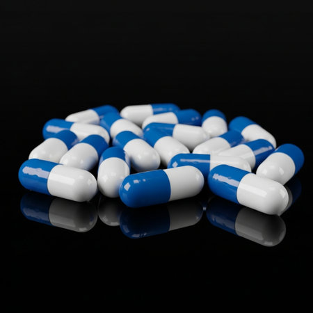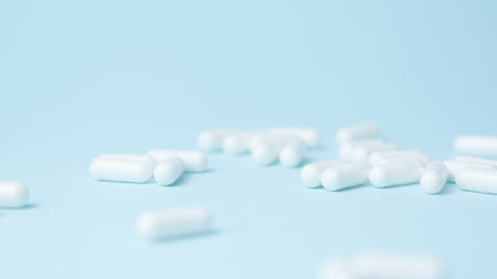 Brightly colored capsules are scattered across a plain white surface, highlighting a medical theme with attention to detail and composition.