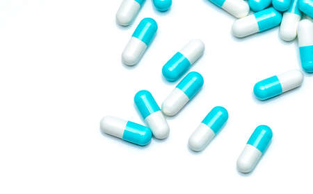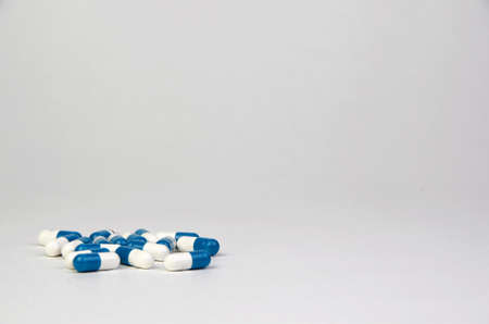 Blue and white capsules pill spread on white background with shadow . Global healthcare concept. Antibiotics drug resistance. Antimicrobial capsule pills. Pharmaceutical industry.