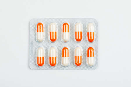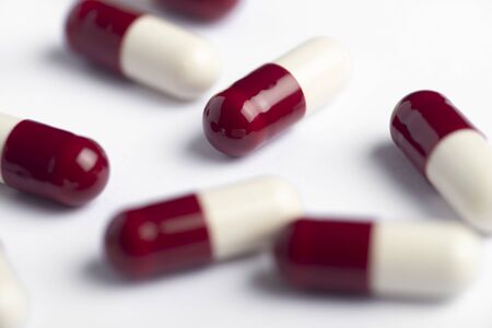 Macro shot detail of red, white antibiotics capsule pills isolated on white background with copy space. Antibiotic drug use with reasonable concept. Antimicrobial drug resistance concept.