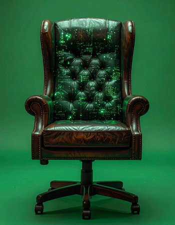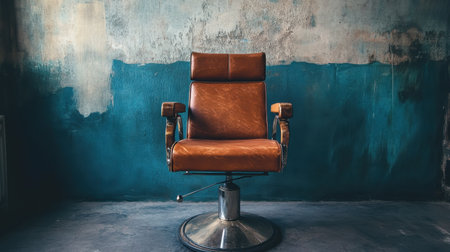 A vintage barber chair stands alone in a retro barbershop, surrounded by a textured wall, showcasing a blend of modern and classic design elements.