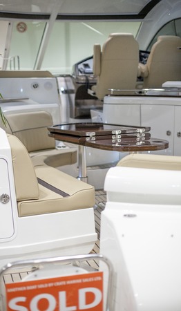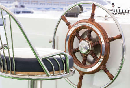 Steering wheel and dashboard of the yacht. Place seat captain. close-up