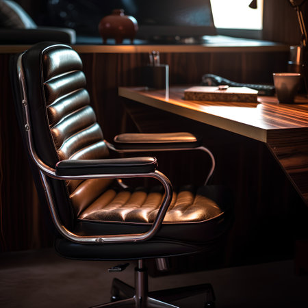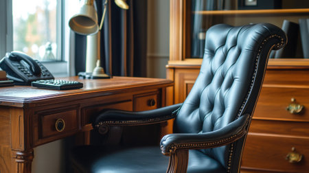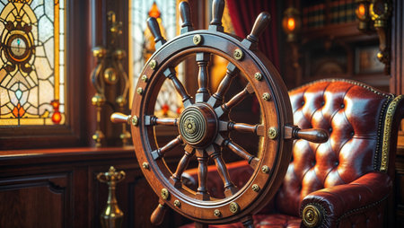 A classic wooden ship wheel with brass details stands prominently in an opulent captain's cabin. Surrounded by rich wood paneling, stained glass windows, and a tufted leather armchair, the scene evokes a sense of nautical tradition and timeless elegance. Ideal for maritime themes, leadership concepts, and vintage interior visuals.