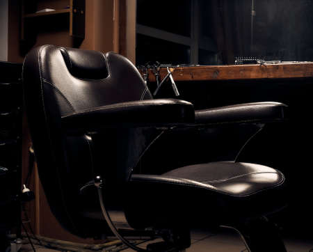 Red empty chair placed in barber shop. Horizontal indoors shot.
