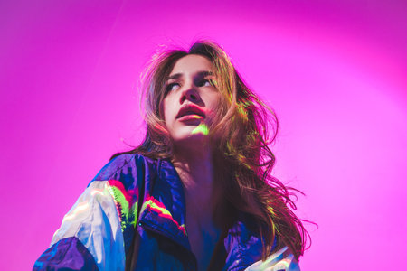 Young woman with long hair wears a colorful windbreaker, sitting against a vibrant pink background with neon light effects.
