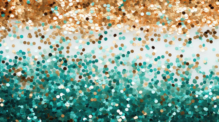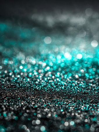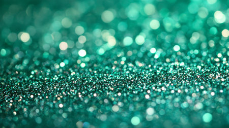 Close-up of shimmering teal glitter with soft, defocused bokeh lights, creating a vibrant, sparkling, and festive abstract background.