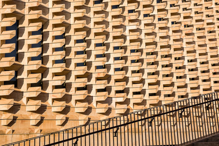 Los Angeles, California, United States - August 9, 2018: details of window of The Broad, a contemporary art museum designed by architects Diller Scofidio Renfro, LA Downtown. Architecture background.