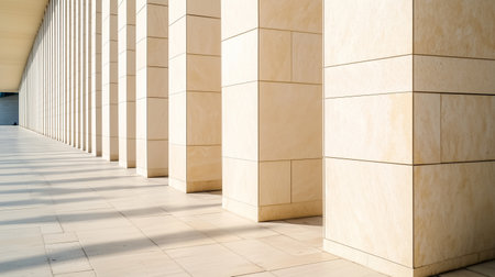 Modern architecture features long columns and shadows highlighting the design on a sunny day