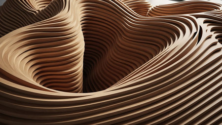 An abstract sculpture crafted from layered wooden strips forms flowing organic waves and undulating curves, showcasing texture and natural