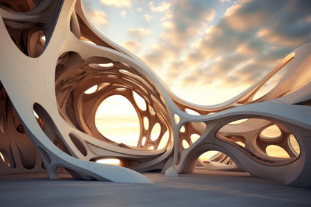 Explore this intricate 3D rendering of golden structures with delicate curves, showcasing an elegant interplay of light and organic forms in a mesmerizing abstract design.