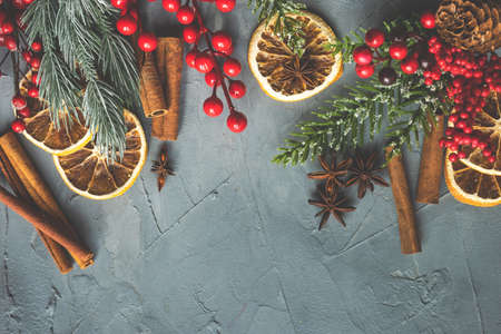 Christmas frame with fir tree, berries, cones and decor on rustic concrete background