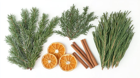 Minimal Christmas flat lay with green fir branches, cinnamon sticks, and dried oranges on white background, cozy copy space