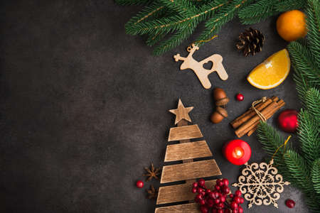 Christmas decoration with fir-tree, orange, candle and wooden icon decor. Holidays concept background. Top flat lay.