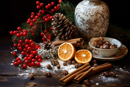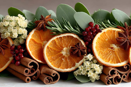A beautifully arranged festive composition featuring dried orange slices, cinnamon sticks, star anise, and lush greenery. this decorative setup evokes a warm holiday ambiance, perfect for seasonal decorations or festive displays. Generative AI