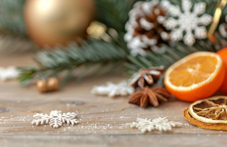 christmas spirit fragrant spices anise and cinnamon lie on a wooden table, dry slices of orange