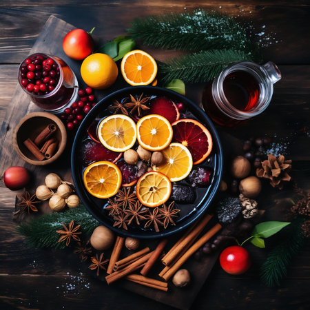 Christmas mulled wine with spices and fruits on wooden background. Top view