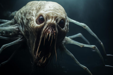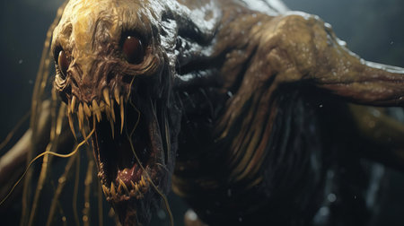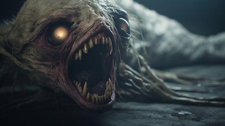 creature with eye and open mouth in a scary scene, featuring natural color grading with gritty, desaturated tones. the wide perspective shot, enhanced by studio lighting, creates a sense of mystery and the unknown. this cinematic visual style, reminiscent of a gritty horror film, is directed by christopher nolan. ai generated
