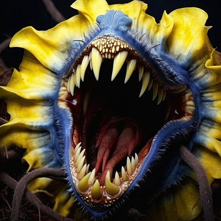 an enormous, scary creature with giant teeth and a big mouth dominates the moody and atmospheric marine scene. rendered in unreal engine, this transfixing image showcases the character design of the creature. the zeiss batis 18mm f2.8 lens captures the dark teal and light yellow tones, enhancing the overall visual impact of this captivating systems art. ai generated