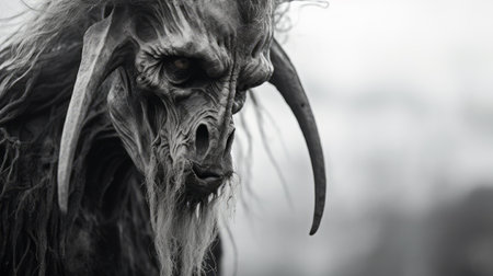a demonic creature with large fangs and horns is depicted in this image, rendered in the style of unreal engine. the detailed atmospheric portrait showcases dark white tones and multi-layered textures. twisted branches add to the eerie atmosphere, while varied brushwork techniques create an eerily realistic effect. ai generated