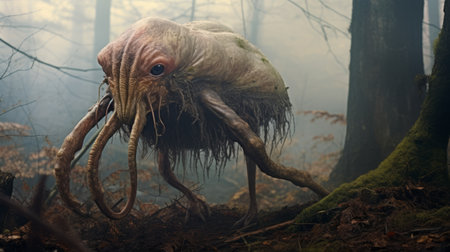 Eerie Forest Monster Concept Art with Detailed Tentacles and Menacing Mouth Emerging from Mist AI Generative