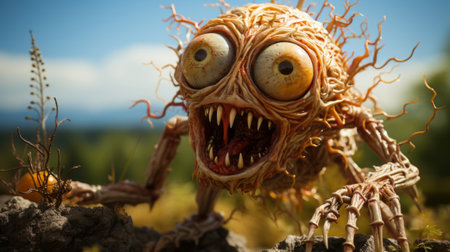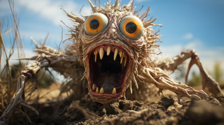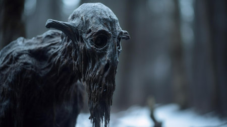 the creature, with its unblinking eye and agape mouth, dominates this haunting scene, evoking a sense of mystery and the unknown amidst natural, desaturated tones and gritty textures, reminiscent of a christopher nolan-directed horror film, shot from a wide perspective with cinematic studio lighting. ai generated