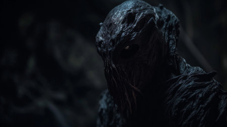 a dark and haunting halloween desktop wallpaper featuring a terrifying shadow monster. this hyperrealistic artwork, inspired by dramatic black and white portraits and medieval fantasy, captures the essence of the holiday. shot with a canon eos 5d mark iv and fujifilm x-t4, this close-up image evokes the art of the upper paleolithic era. ai generated