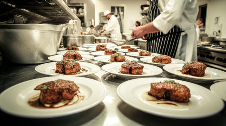 A bustling professional kitchen showcasing skilled chefs meticulously plating gourmet dishes, emphasizing culinary artistry and teamwork in food preparation.