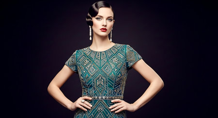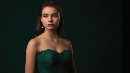 A stylish fashion portrait of a woman wearing a green dress, set against a studio background.