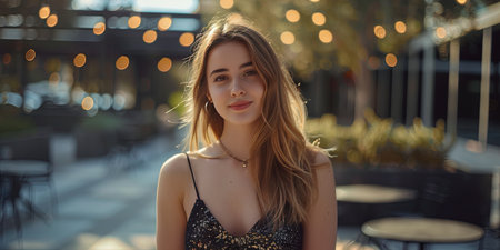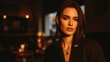 pretty woman in evening dress , with hair style posing near a restaurant bar , looking in camera .