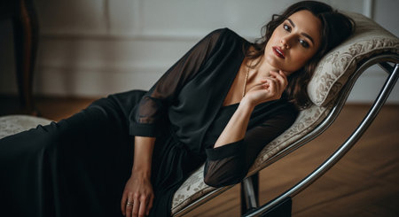 Portrait of a beautiful woman in a black dress sitting on a sofa in a luxurious interior.
