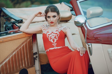 Magnificent young woman in evening red dress is sitting in the armchair in a luxury apartment. Classic vintage interior. Beauty, fashion. Evening makeup and hairstyle.