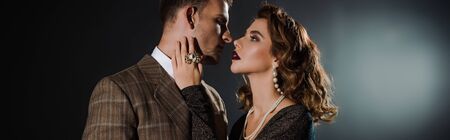 panoramic shot of man hugging and kissing attractive woman isolated on black