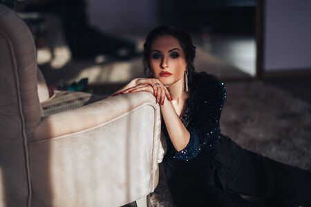 Glamor lady portrait in luxury dress. Beautiful model girl with perfect fashion makeup and hairstyle. Elegant girl, in a luxury interior.
