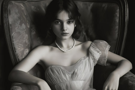 Black and white portrait of a young girl wearing a pearl necklace and satin dress sitting on an elegant armchair