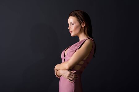 smiling elegant woman in dress and jewelry posing isolated on grey background