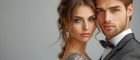 Model Woman and Man in a Fashion Couple. A suave man and a luxury glamour girl wearing silver dresses. Putting on makeup and hair for an evening on a grey background