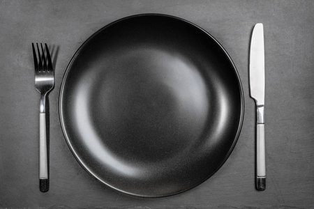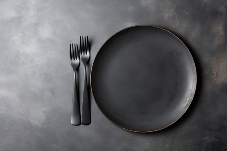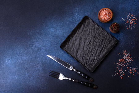An empty black plate with cutlery on a dark concrete background. Home dinner cooking on stone table