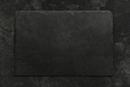 top view of empty black slate plate on cement background. Empty space for your design.