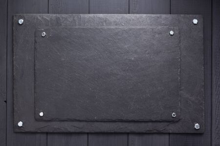 slate stone nameplate or wall sign at black wooden background texture surface, with screws