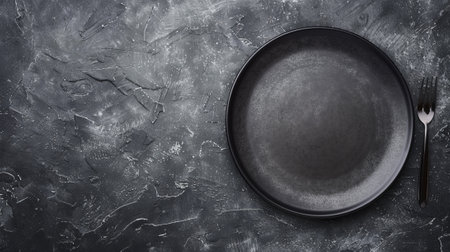 Black food plate on dark grey textured concrete background Copyspace