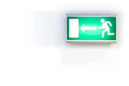 Green fire exit sign or board on yellow wall background for giving direction to exit when have fire in building or place. Informing or warning people.