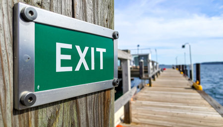 A weathered green exit sign points the way forward along a sunlit wooden pier.