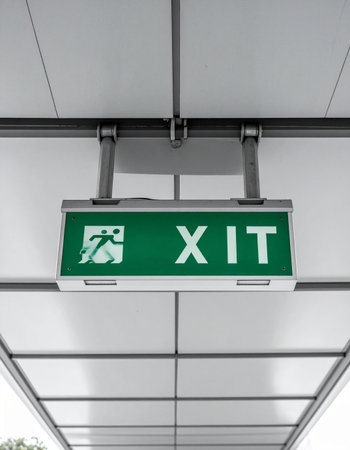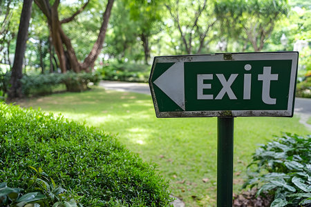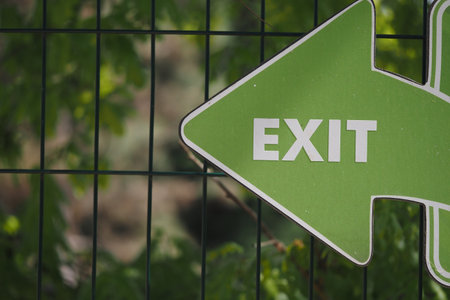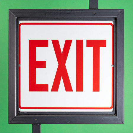 A clear and direct red exit sign is prominently displayed against a vibrant green background.