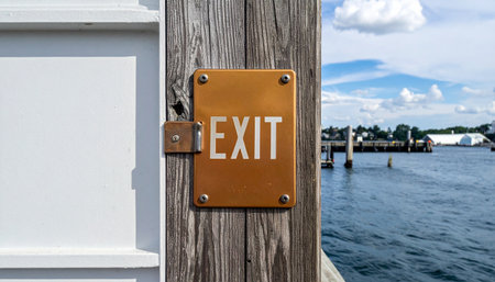 A weathered brass exit sign with a hanging padlock is mounted on a rustic wooden post at a harbor.