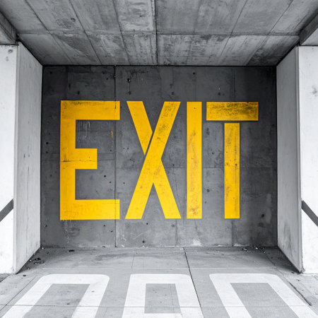 A bold, yellow 'EXIT' sign is stenciled onto a stark, gray concrete wall, offering a clear and unmissable point of departure.