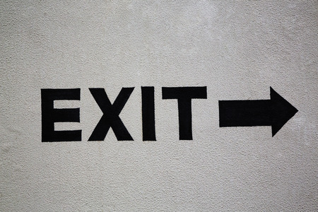 Exit message with directional arrow painted on a concrete fence
