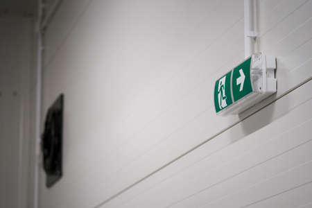 Green fire escape sign hang on the ceiling in the Warehouse. The concept of fire escape training and preparation for evacuation