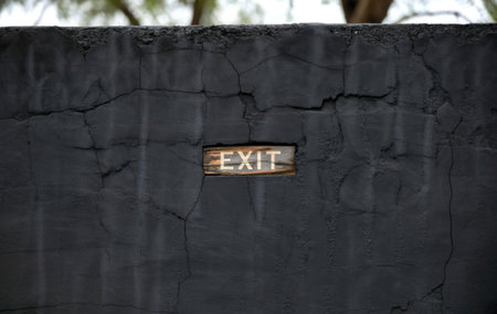 A weathered wooden sign reading EXIT is embedded in a dark, heavily cracked concrete wall. The background is blurred, suggesting an outdoor setting.