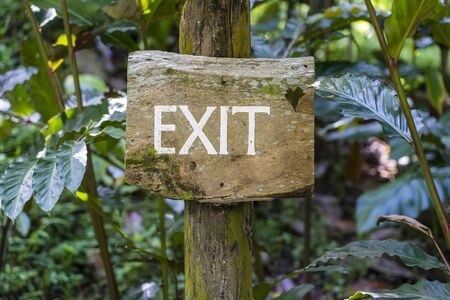 Text EXIT on a wooden plate in a rainforest jungle of tropical Bali island, Indonesia. EXIT inscription in the asian tropics.