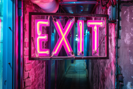 Vibrant Neon Exit Sign Illuminates Evacuation Route in Hallway Corridor During Emergency