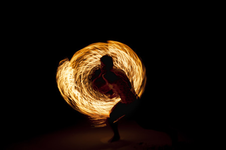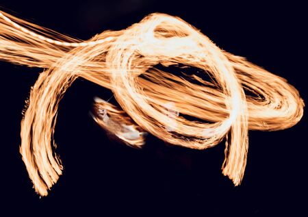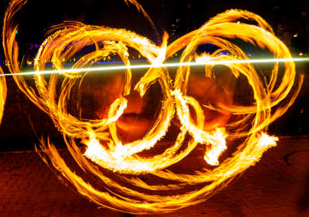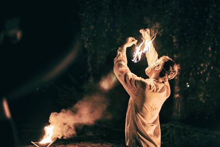 Fakir show. Happy man manipulate with burning poi. Fire fakir perform dangerous tricks.
